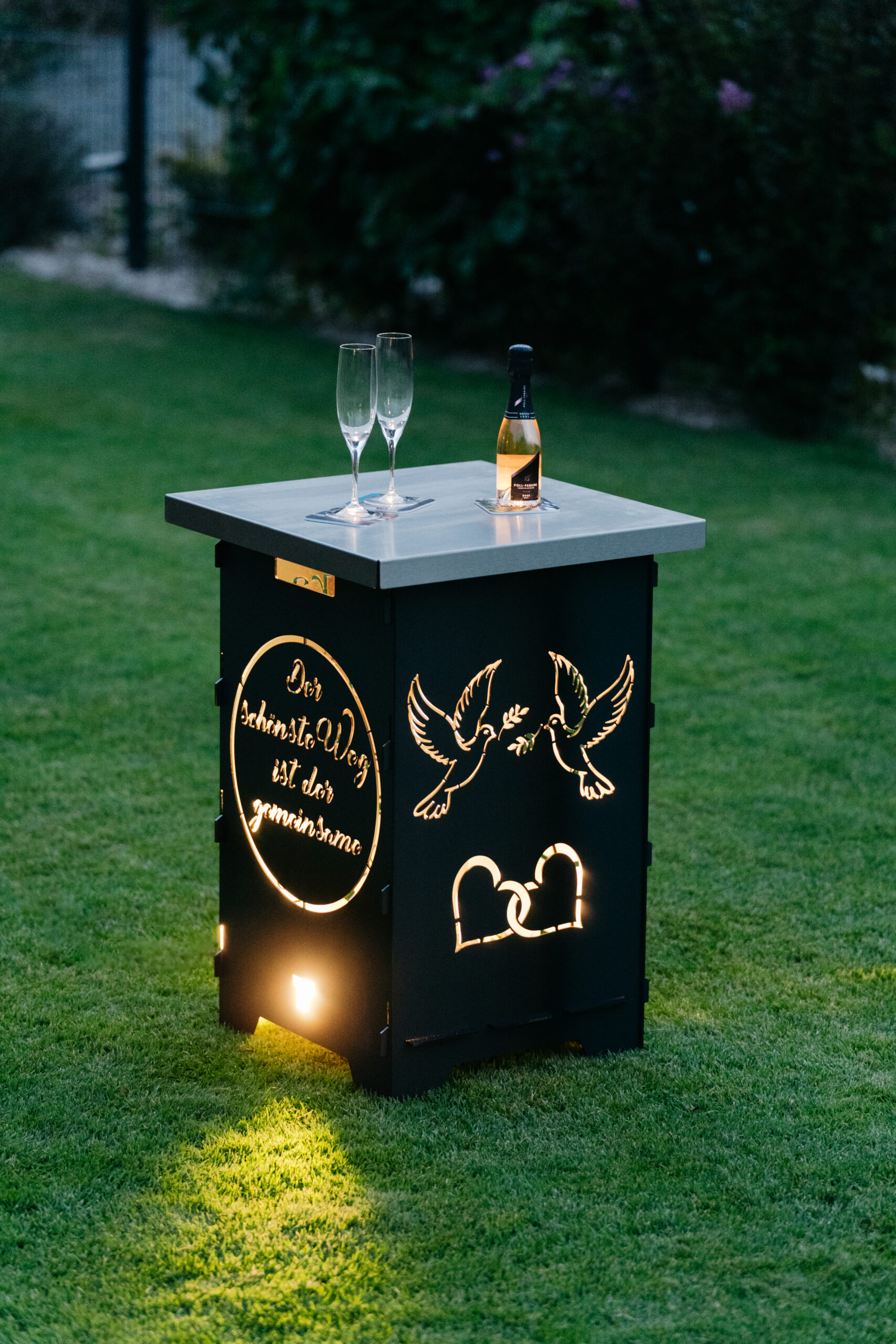 Eine elegante Aschewanne aus Edelstahl kann optional hinzugefügt werden. Da sie rostfrei ist, schützt sie zuverlässig Pflaster und andere Untergründe. Zudem eignet sie sich hervorragend als stilvolle Ablagefläche. In Kombination mit einem sanften Licht verwandelt sich der Feuerkorb in einen charmanten kleinen Tisch, der garantiert zum Blickfang wird.